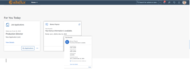 In this example, you can see job applications the employee has applied to and can click to go further and view the actual application. You can also see a Bonus Payout card with payout information. These are just a couple of examples. To see the full list of Engagement cards, read this SAP Knowledge Base Article.