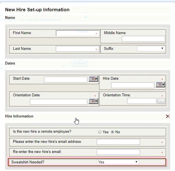 SAP SuccessFactors Onboarding provides a number out of the box features like I-9 forms, direct deposit, emergency contact, etc. However, we've found that clients often want to collect information that is not included in the out of box functionality.