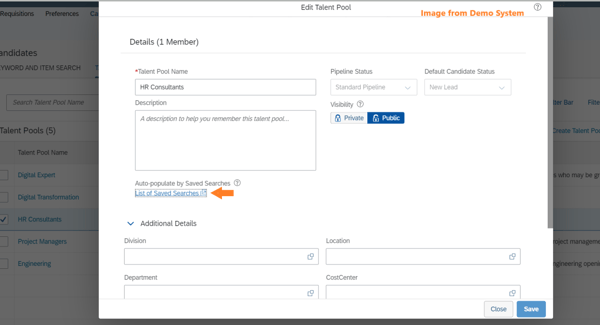 Use the search box to find your “saved search” and click add. You can add as many saved searches as is appropriate for your talent pool, just repeat the process and when finished, click close and then save.