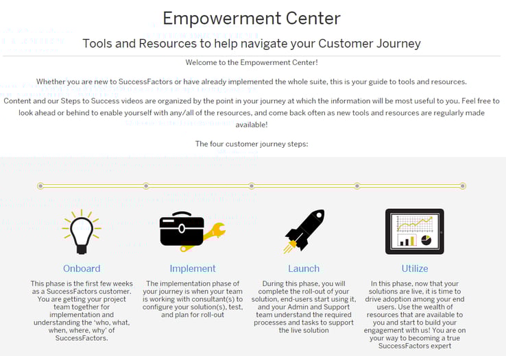 Empowerment Center You might as well login to the SuccessFactors Community and add the Empowerment Center page as a favorite as soon as you finish reading this post. Here, you will find all of the Admin training, product information and helpful links housed in one location. The information is organized by steps in the SAP SuccessFactors customer journey: Onboard, Implement, Launch and Utilize. If you aren’t sure what step you are in – just scroll to the bottom of the page to view all.