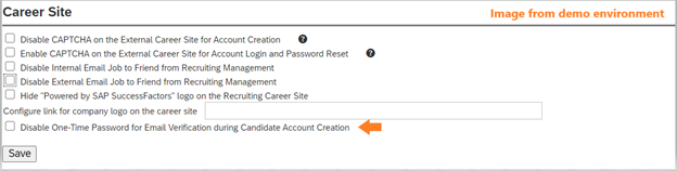 After reviewing the documentation and best practices, if your organization decides not to use the added OTP verification feature, it can be disabled in Admin Center, by navigating to Manage Recruiting Settings. Under the Career Site section, select the check box for “Disable One-Time Password for Email Verification during Candidate Account Creation.