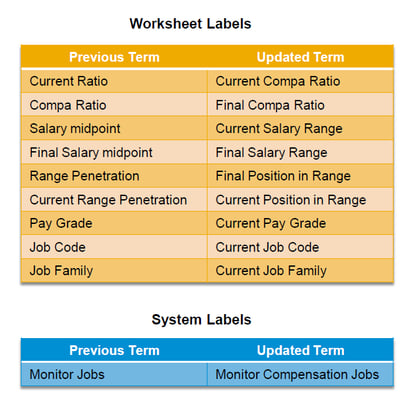 Some of the standard field labels in compensation module are updated for clarify. This feature does not impact existing templates configured.