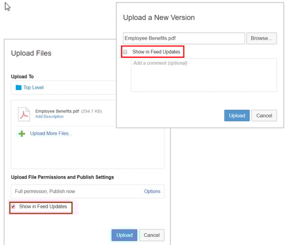 Users can decide whether a document upload is considered a significant event that warrants a group feed update. Works for initial and each subsequent upload.