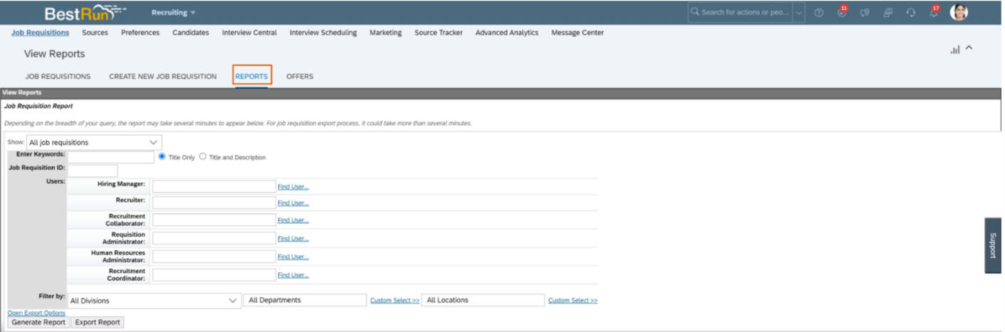 Requisition reports were a feature that allowed for reporting on requisition data only, directly from the recruiting tab. To consolidate reporting, this feature was deprecated in the 2H 2021 release. As an alternative, customers can use table reports, or if enabled, can access Recruiting data (including requisition data) from Story Reports in People Analytics.