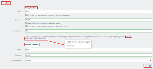 Jobs can now be posted to multiple locations at once on job boards that support multiple locations. Before this enhancement, you could only post to a single location at a time. This enhancement saves the recruiter time by eliminating the need to create several different postings for various locations. For job boards that do not support multiple locations, provide only the primary location.