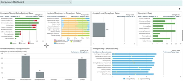 Competency Dashboard: Overview of the most common competencies, competency gaps and competency ratings.