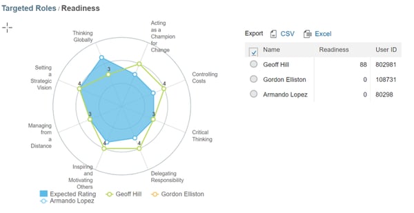 CDP Dashboard: See targeted roles among people in your team and the competency readiness for those roles.