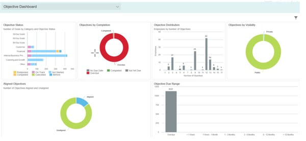Objective Dashboard: Overview of objective status, objective alignment and objective distribution.